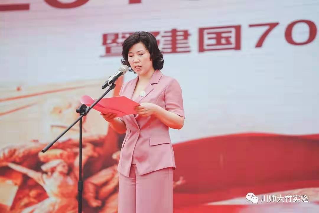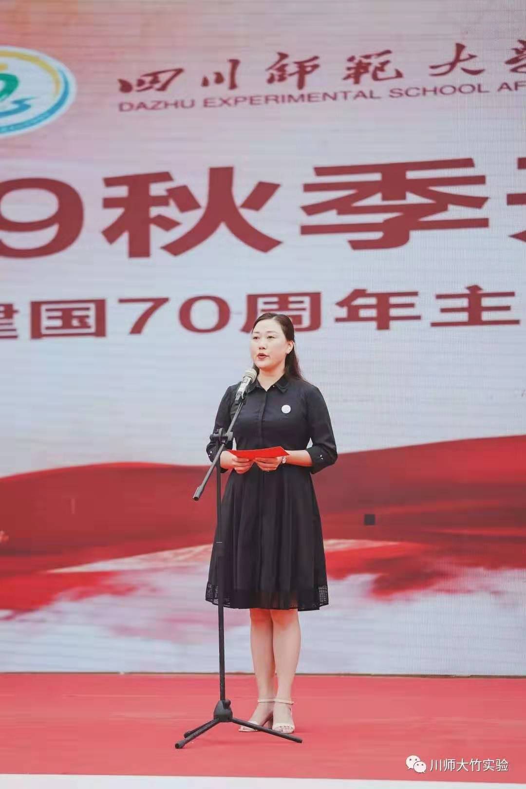 典礼仪式开始前,顿儒萍宣布四川师范大学附属大竹实验学校“我与祖国共成长” 建国70周年主题教育暨开学典礼正式开始!